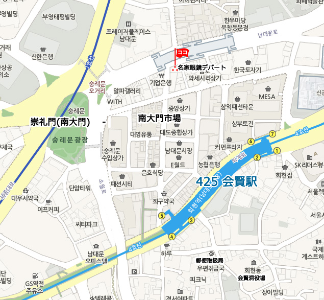 現地 アクセス  地下鉄 4号線の会賢駅 (No.425 フェヒョン・Hoehyeon)で降りて、