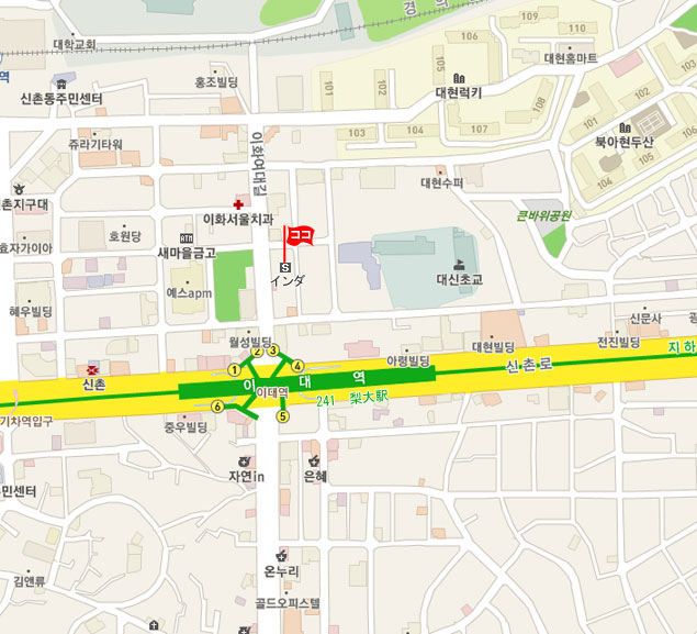 現地 アクセス          地下鉄 2号線の梨大駅 (No.241 イデ・Ehwa Womans Univ)で降りて、