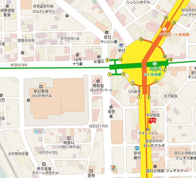 地下鉄 1号線と2号線の 西面 (No.119、No.219 Seomyeon)駅で降ります。 ロッテデパート方面へ歩くと、右側にあります。徒步 約2分所要。