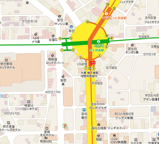 現地 アクセス  地下鉄 1号線と2号線の 西面 (No.119、No.219 Seomyeon)駅下車。