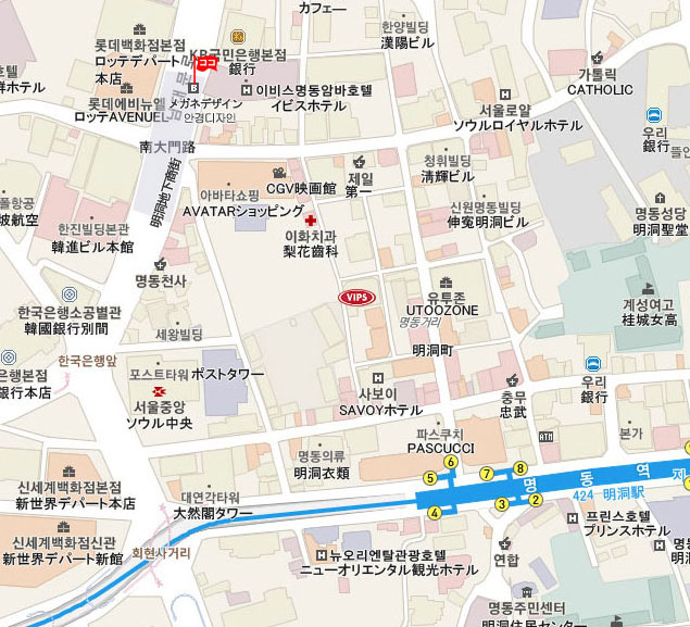 住所 ソウル市 中区(チュング) 南大門路2街(ナンデムンロイーガ) 123 明洞地下商街 ラ-13号(ロッテ百貨店前)