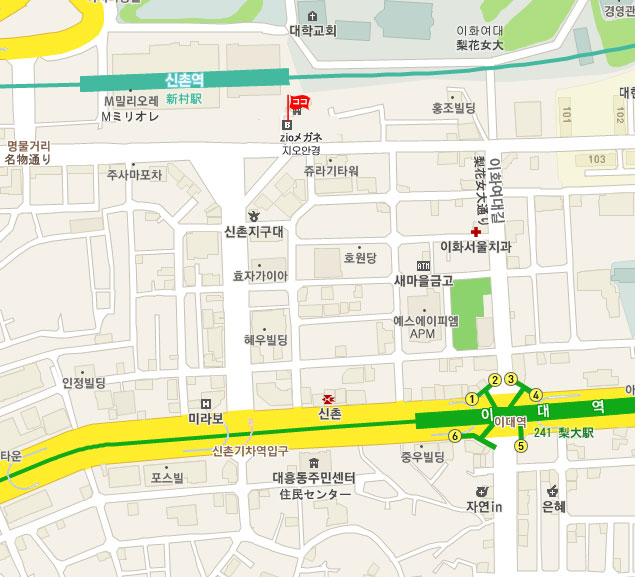 現地 アクセス  地下鉄2号線梨大(イデ、Ewha Womens Univ)駅2番出口 徒歩10分
