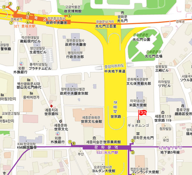 現地 アクセス  地下鉄 5号線の光化門駅 (No.533 クァンファムン・Gwanghwamun)駅で降ります。