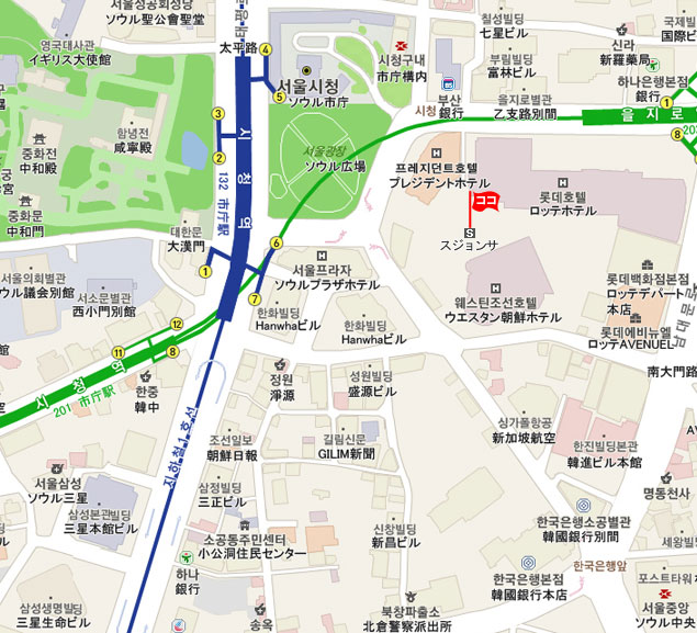 現地 アクセス  地下鉄 2号線の乙支路入口駅 (No.202 ウルチロイック・Euljiro 1(il)-ga)  駅 7番出口から徒歩 約7分所要。
