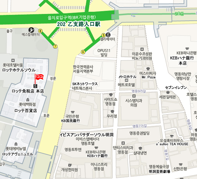 地下鉄 2号線の乙支路入口駅 (No.202 ウルチロイック・Euljiro 1(il)-ga)で降りて、駅 8番出口直結 |