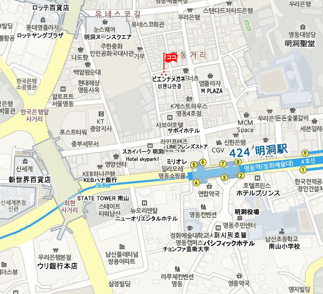 現地 アクセス  地下鉄 4号線の明洞駅 (No.424 ミョンドン・Myeong-dong)6番出口から徒歩約3分。