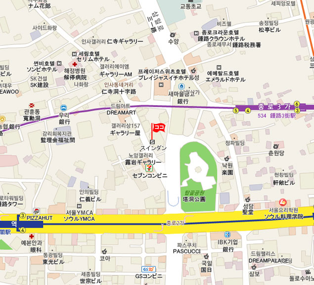現地 アクセス  地下鉄 1号線鐘閣駅 (No.131 ジョンガク・Jonggak)3番出口から徒歩約5分所要。