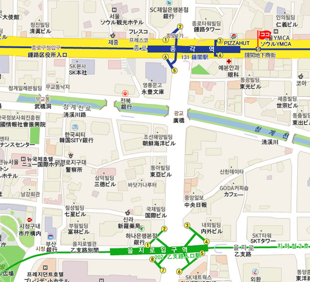 現地 アクセス  地下鉄 1号線の鐘閣駅 (No.131 ジョンガク・Jonggak)で降ります。鐘閣駅と直結。