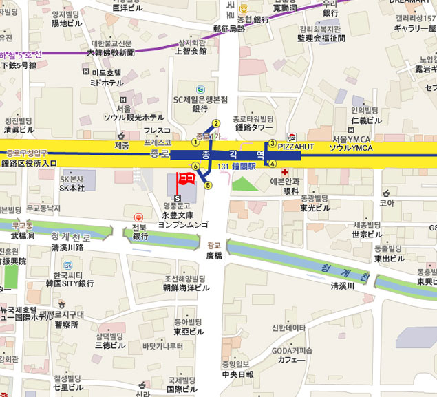 現地 アクセス  地下鉄 1号線の鐘閣駅 (No.131 チョンガッ・Jonggak)駅で降ります。