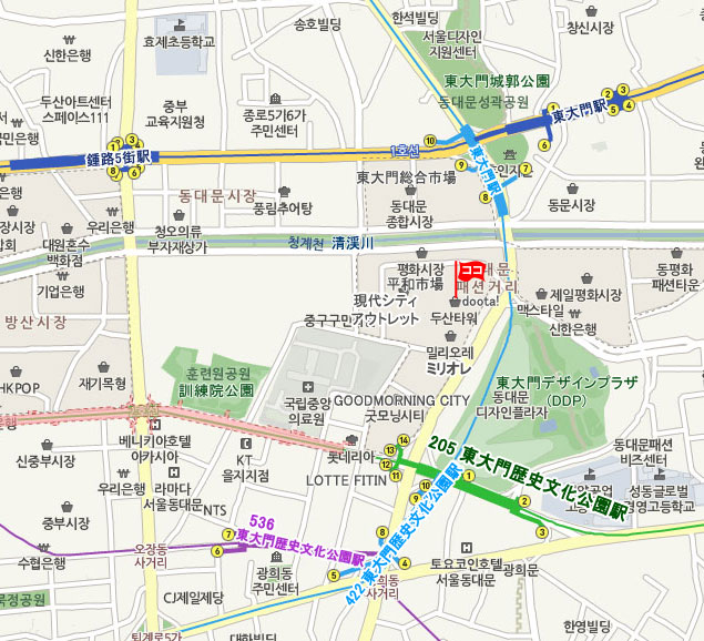 地下鉄 1·4号線の東大門駅 (No.128 · No.421 トンデムン・Dongdaemun) 駅8番出口から徒歩 約5分所要。