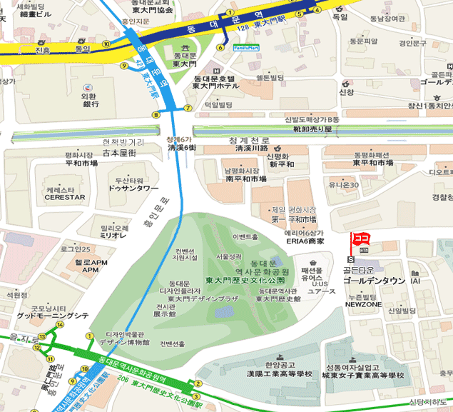 ①地下鉄 1·4号線の東大門駅 (No.128 · No.421 Dongdaemun)7番出口徒歩 約 6分所要。