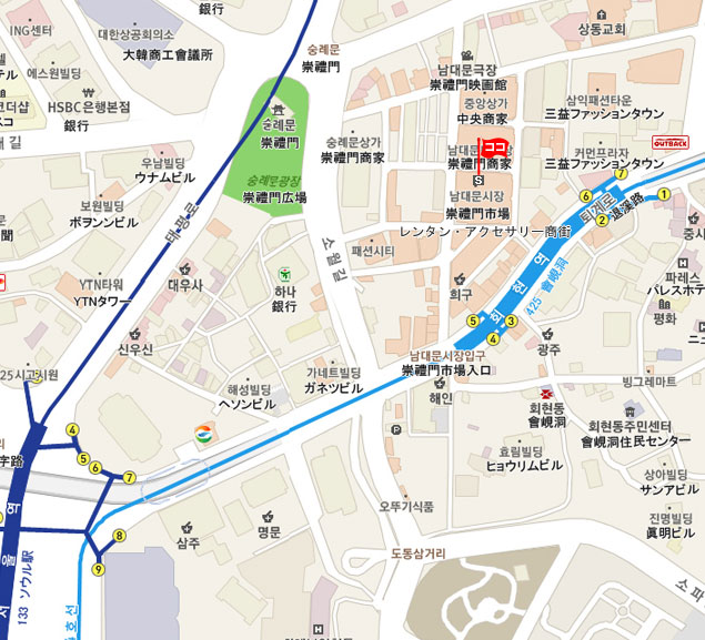 現地 アクセス  地下鉄 4号線の会賢駅 (No.425 フェヒョン・Hoehyeon)で降り、