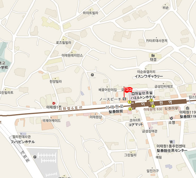 現地 アクセス  地下鉄 6号線の梨泰院駅 (No.630 イテウォン・Itaewon)1番出口徒步約2分