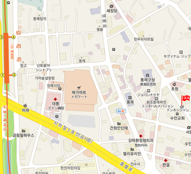 現地 アクセス  地下鉄1号線の東莱(トンネ・Dongnae)駅下車後、2番出口出て徒步 約10分所要。