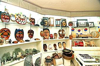 私立博物館の済州民俗博物館は、済州道の庶民的な遺物が主な展示物です。これら展示物は、すべてが実際に昔の人々が使用していた物となっています。博物館の建物の1階は特別展示場、2、3階は常設展示場として使われていて、約1万点余りの遺物が保管されています。実際に展示室で見られる遺物は全体の三分の一程度で、竹やわら、石などで作った庶民的なものが大部分です。海女たちが使っていた道具、海に入るときに着ていた水着、石臼なども見ることができます。また、済州島独自の民間宗教の巫俗信仰や固有風俗に関連した不思議な物も見学できます。