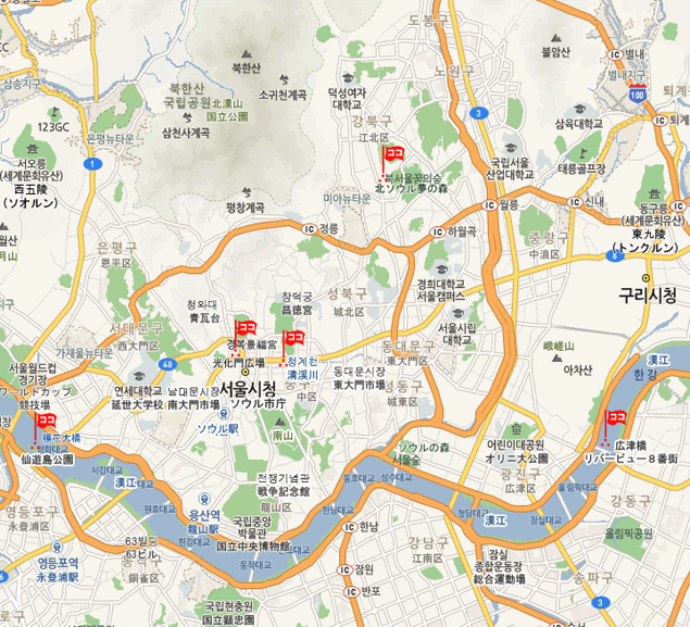 ※ garden5 ホームページ:http://www.garden5.com/(日本語あり) アクセス:地下鉄8号線 長旨(Jangji.819)駅3番出口すぐ ※ 北ソウル夢の森展望台 ホームページ:http://dreamforest.seoul.go.kr/ (韓国語) アクセス:地下鉄4号線 弥阿(ミア)サンゴリ(Miasamgeori.416)駅2番出口からタクシー利用5分 ※ 広津橋リバービュー8番街 ホームページ:http://www.riverview8.co.kr/ (韓国語) アクセス:地下鉄5号線 クァンナル(gwangnaru.546)駅2番出口から徒歩約15分