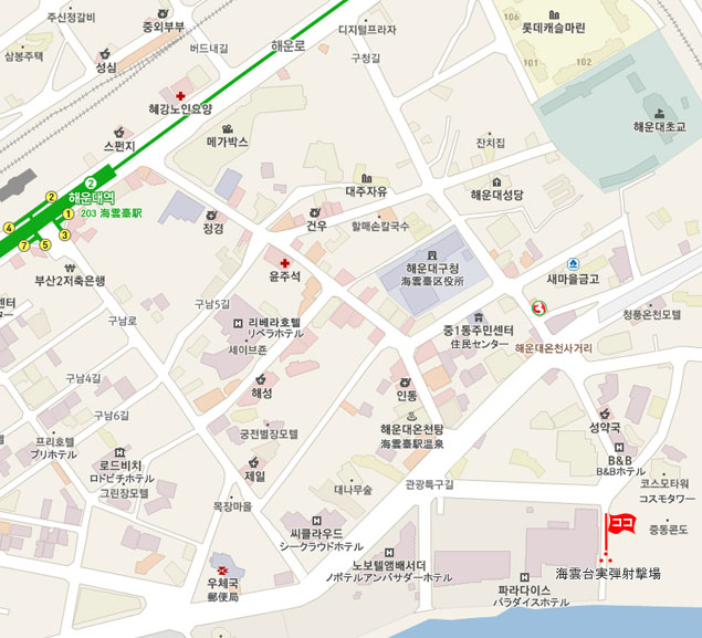 現地 アクセス  地下鉄 2号線の海雲台(ヘウンデ)駅下車。出口3または5番を出て、徒歩10分。