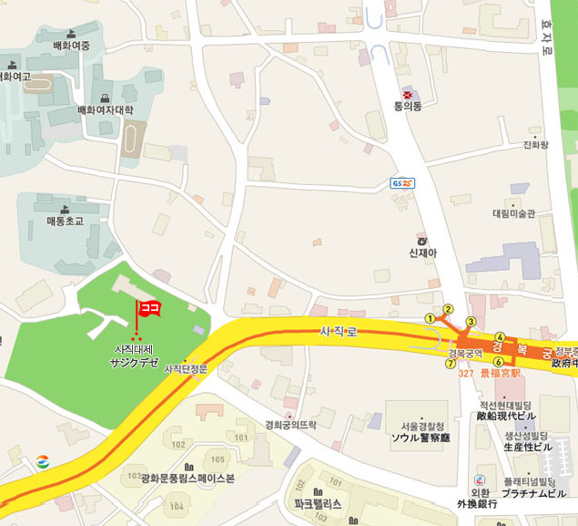現地 アクセス   地下鉄3号線NO.327景福宮駅(キョンボックン・Gyeongbokkung)約10分所要。