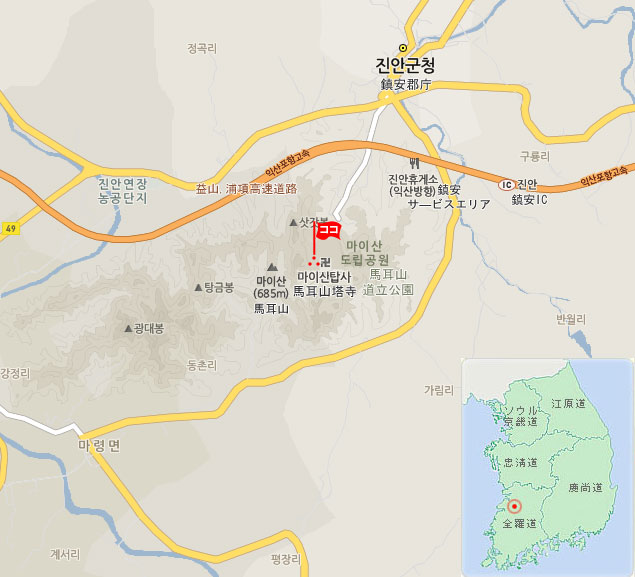 現地 アクセス  鎮安バスターミナルから30分毎に馬耳山行きバス運行、約10分。馬耳山入口から塔寺までは約40分。