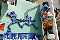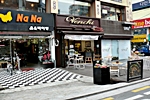 この通りには、ヨン様ことぺ.ヨンジュン氏がプロデュースした「ゴリラ・イン・ザ・キッチン」や、以前は神話がオーナーだった「キョチョンチキン」、ドラマ「天国の階段」の撮影で使われたコーヒーショップの「PASCUCCI」などレストランやカフェが並んでいます。その間に海外ブランドショップと個性的なデザイナーショップが仲良く並んでいます。女性服専門の「一点紅(イルチョムホン)」とその姉妹店の「Nora Street」。オリジナル帽子のkAoRi、女性用シューズの専門店「ダーリングシュー」など素敵なお店が一杯です。韓国はショップの入れ替わりが激しく、新しいお店のオープンも、また他の場所への移転もよく行われます。その分常に流行の先端を行くことができるという点は嬉しいですね。