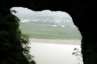 南漢江の流れの真ん中に立つ3つの峰。一番大きな中央の「男峰」を、妊娠し張り出したお腹を抱え男峰を見つめる「妾峰」と、夫を憎み反対側を向いて立っている「妻峰」が挟んで立っています。 島潭三峰から300メートルほど離れた場所にある天然の門で、神仙たちが通る門と言われています。