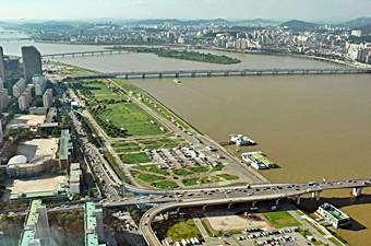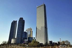 汝矣島(ヨイド)のシンボルともいえる「63ビルディング」。63ビルディングは高さ 264mで、地上60階、地下3階の全63階の高層ビルで1985年に完成しました。全面二重反射ガラスで覆われているので、太陽の光を浴びると美しい金色に輝き、側を流れる漢江(ハンガン)によく映えます。韓国内ではもちろん外国人観光客からも人気の観光地としても知られ、特に60階に設置された展望台はソウルや、遠く仁川(インチョン)まで眺めることができ夜景スポットとしても人気があります。2008年 7月にリニューアルされ、展示場などの文化空間も併設ますます充実した複合文化施設となりました。