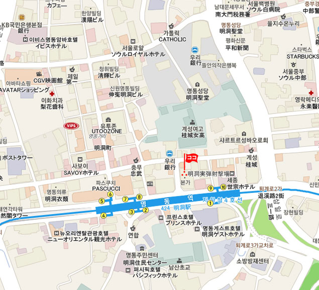 現地 アクセス     地下鉄4号線 明洞駅下車。9番出口より 徒歩5分。