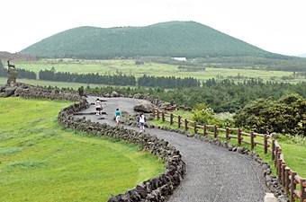 済州島の最高峰、漢拏山(ハルラサン)には噴火口がいくつかありますが、サングムブリは周囲が2kmを超える噴火口で、天然記念物に指定されています。噴火口の直径は650メートル、深さ100メートル、周囲が2,070メートルにもなります。サングムブリを空から眺めると、人工的に造られた円形運動場のように見えます。この噴火口には植物の種類が多様で、北側は暖帯性の樹木(アカガシ、ホオノキなど)と希少植物のフユイチゴが生えています。