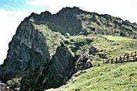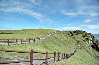 城山日出峰(ソンサンイルチュルボン)は10万年前、海底噴火によってできた海抜182メートルの高さにある噴火口です。城山日出峰は済州島の最も東側に位置し頂上には巨大な噴火口が残っています。噴火口は直径600メートル、高さが90メートルで、面積が8万坪にもなり、大きな王冠のようにとがった99個の鋭い岩が噴火口の周りを囲んでいます。東・南・北側は海に面した絶壁です。西北面だけが芝が稜線に生えており城山村まで続いています。西北面は散策路もあり、景色を楽しみながら散策も出来ます。