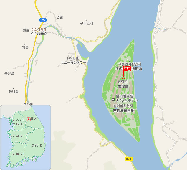 南怡島(ナミソム)リゾートは清平(チョンピョン)ダムを作る際にできた弓形をした小さな島。南怡島という名前は島の中に朝鮮王朝時代に反乱を平定して大きな業績を立てた南怡将軍(1441-1468)の墓があることに由来しています。南怡島はソウルから春川方面に63キロ離れた所にあり、長く延びた並木道が有名です。南怡島は豊かな自然に恵まれ、ソウルから約1時間ほどで行けるアクセスのよさから、以前から恋人や家族連れなどで賑わう観光地でした。2002年に放送されたドラマ「冬のソナタ」の国内外での爆発的な人気からロケ地である南怡島は一気に知名度が上がり、アジア圏からの観光客が急増しました。