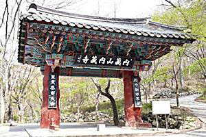 内蔵寺は百済636年に 霊隠祖師が創建した寺で、全羅北道の名山である内蔵山(ネジャンサン)国立公園の中にあります。本来の名前は霊隠寺で、その後何度かの焼失と再建を繰り返したが、朝鮮戦争時に全焼。現在の建物は1970年代に再建されたものです。国立公園の入り口にある食堂やみやげ物店、公園事務所の入り口のゲートを過ぎると、小さな渓谷の内蔵川があります。渓谷沿いの散策路に沿って30分ほど歩くと左側に池が一つあり、池の中に羽化亭という東屋があります。この羽化亭を過ぎて少し行くと左側にケーブルカー乗場があります。内蔵山燕子峰展望台(667m)まで上がるケーブルカーで、時間は5分くらいです。ケーブルカー乗場を通るとすぐ内蔵山探訪案内所があり、さらに行くと内蔵寺の最初の山門である一柱門に出ます。